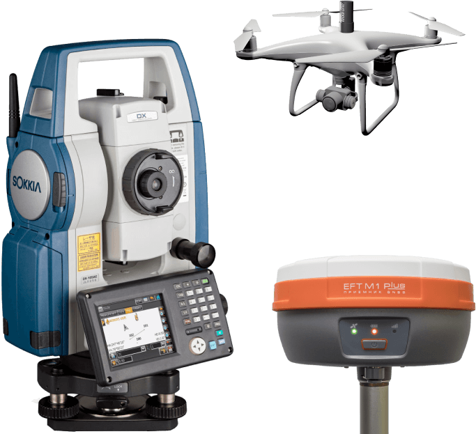 В нашем распоряжении современное электронное и спутниковое маркшейдерско-геодезическое оборудование марок Sokkia, PrinCE, EFT, программное обеспечение (ПО) - Autocad CIVIL 3D, ПО «Топография»; модернизированные квадрокоптеры DJI Phantom 4 Pro TOPODRONE