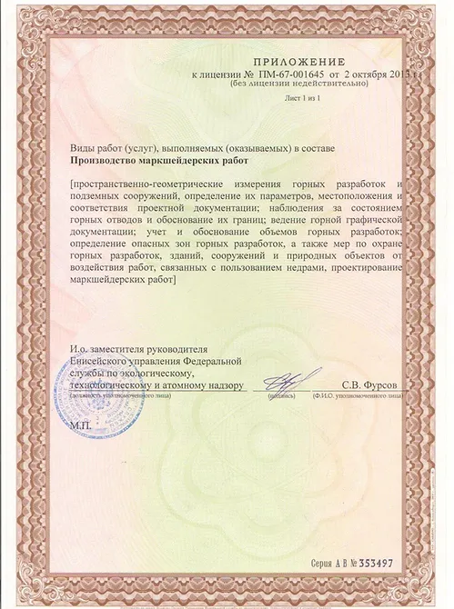 Компания была основана в 2012 году. Специалисты нашей компании имеют высшее маркшейдерское, горное и геологическое образование, регулярно повышают профессиональную квалификацию, а также имеют необходимые аттестации в области промышленной безопасности.